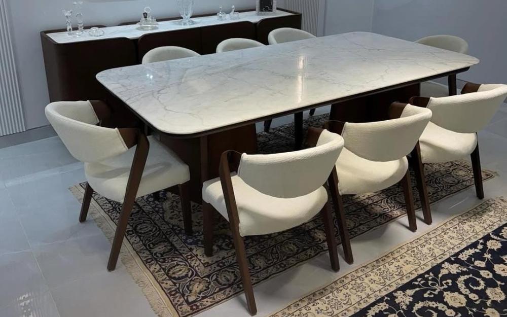 سطح رخام صناعي أنيق يضيف لمسة من الفخامة على غرفة الطعام.