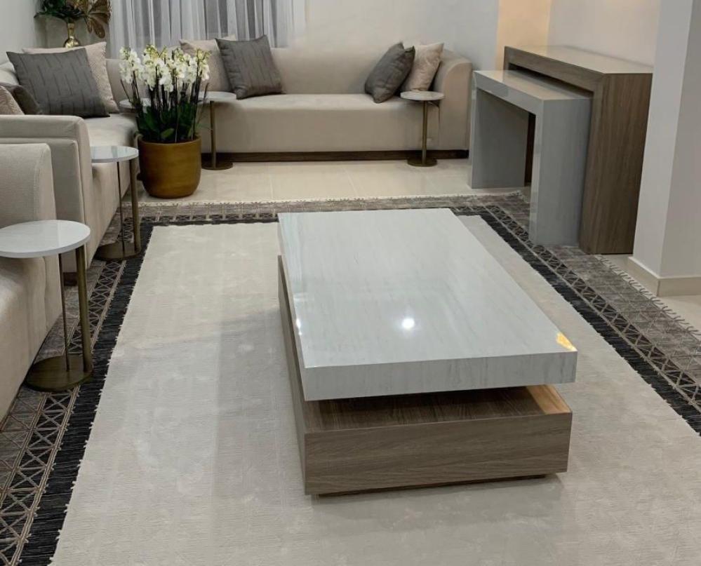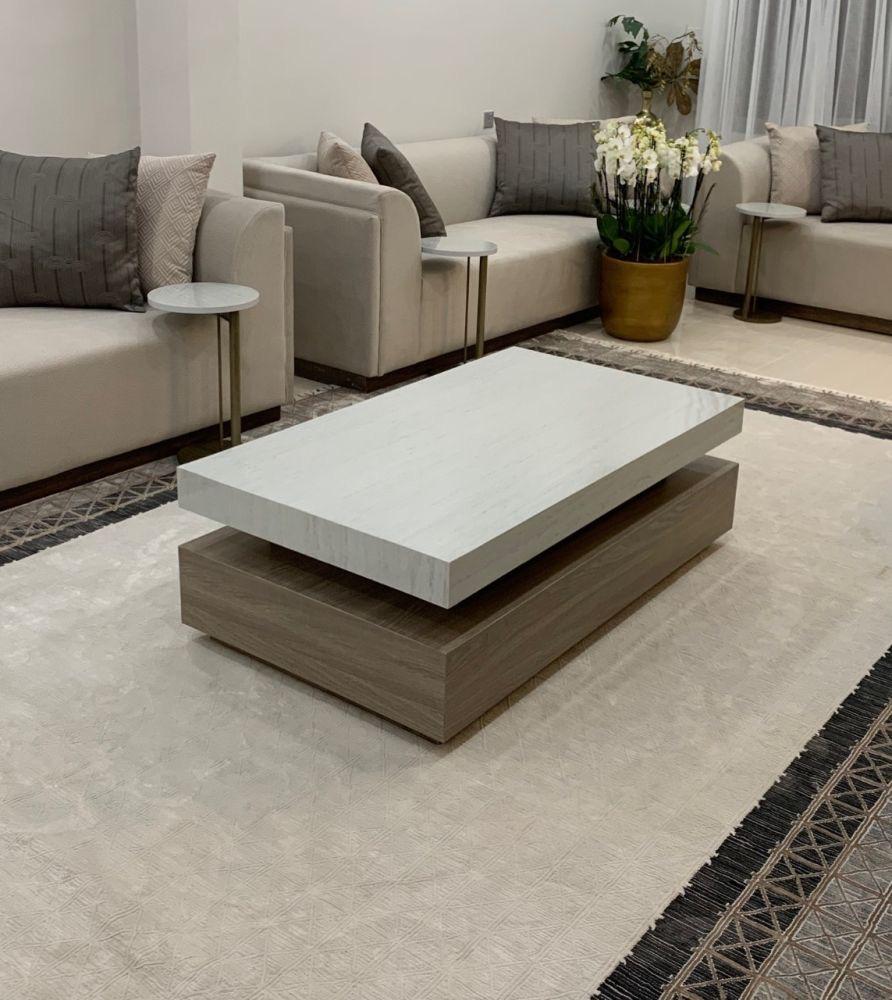 طاولة قهوة مركزية بسطح واسع بتصميم رخامي جذاب، مثالية لوضع المشروبات، الكتب، والديكورات.